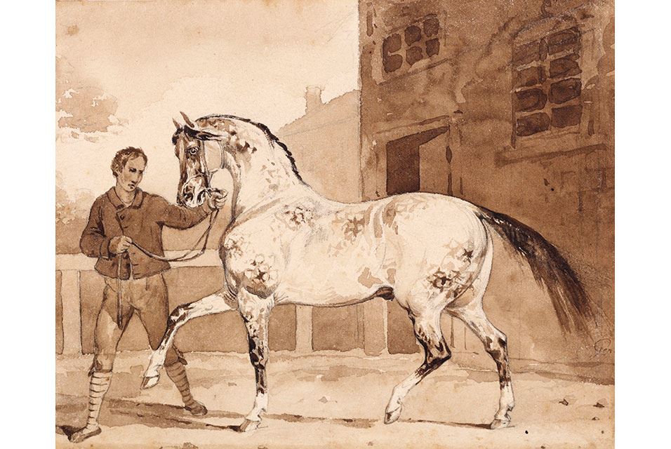 January 26, 1824. Jean-Louis André Théodore Géricault (26 September 1791 - 26 January 1824) was a French painter and lithographer. His best-known painting is The Raft of the Medusa. Despite his short life, he was one of the pioneers of the Romantic movement. In this image: Gericault, A Dappled Grey Horse Led by a Groom, c. 1820-21. Sepia wash over graphite on paper, 13 x 16 cm.
