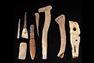 . Native American, Northwestern United States, Alaska, ca. 200 BCE to 1600s CE. This is a remarkable collection of eight utilitarian tools from the ancient Arctic cultures of the Bering Sea region - representing the Ancient Bering Sea, Punuk, Thule, and Inuit traditions. Included are two long, weathered bone adze handles - one angled for hafting a blade, the other pierced for lashing a blade in place. A flat rectangular plate may be a slat armor panel or tool fitting. Estimate: $600 - $900.