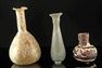 . Roman, Imperial Period, ca. 1st to 3rd century CE. A group of three small glass vessels including two ancient Roman examples and one later elongated vial. The Roman pieces consist of a globular jar with a marvered surface and iridescent weathering and a tall pear-shaped bottle with a narrow neck and pearlescent iridescence. Estimate: $600 - $900.