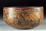 Incised Nazca Abstract Polychrome Pottery Bowl. Pre-Columbian, Peru, Paracas to Nazca, ca. 100 BCE to 800 CE. A pottery bowl with a dark ground, encircled by incised abstract designs, where eye-like motifs nestle within flowing curvilinear bands highlighted in ochre yellow. The interior rim is slipped in red that contrasts with the animated exterior patterning. Estimate: $1,000 - $1,550.