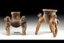 Costa Rican Ticaban Tripod Vessels with Figural Legs. Pre-Columbian, Atlantic Watershed, Costa Rica, Ticaban style, ca. 1 to 500 CE. A lively and engaging pair of Costa Rican Ticaban-style tripod vessels, each animated by sculptural legs that turn functional pottery into narrative form. The pair consists of two ceramic tripod vessels modeled with distinct figural supports. Estimate: $900 - $1,400.