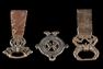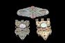 . Western Europe, Medieval to post-Medieval period, ca. 15th to 19th century CE. A group of three decorative metal ornaments, each inlaid with colored enamel or glass. The two nearly identical gold-hued examples are likely belt clasps or mounts, both cast in a copper alloy with approximately 40% gold and 23% silver, featuring central leaded inlays of pale blue and violet. Estimate: $500 - $750.