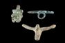 . Central Asia, Tibet, ca. 17th to 19th century CE. A group of three copper-alloy thokcha (thogchag) amulets comprising two buckle clasps fitted with leather loop straps and a circular openwork disc centered by a fu lion creature. The two buckles share a related structure, each with the lower strap loop shaped by confronting dragons whose bodies frame a small zoomorphic face at the midpoint, while the upper registers differ slightly, Estimate: $500 - $750.