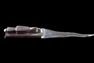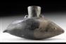 Rare Mississippian Black Effigy Pottery Vessel. Native American, Southeastern United States, Mississippian culture, ca. 1100 to 1600 CE. A rare, compelling, and impressively intact blackware bottle shaped in the streamlined form of a fish, its elegant silhouette captures both the vitality of river life and the sculptural sophistication of Mississippian ceramic tradition. Hand-built from fine clay and carefully burnished to a deep charcoal surface, the vessel assumes a horizontally oriented, lenticular body tapering to pointed head and tail. Estimate: $1,500 - $2,500.