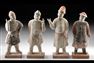 Ming Dynasty Pottery Tomb Attendants - Set of 4. East Asia, China, Ming Dynasty, ca. 1368 to 1644 CE. A dignified quartet of Ming Dynasty tomb attendants stands in quiet procession, each figure animated by subtle gesture and individualized expression. Modeled in pottery and finished in soft white slip with traces of red and black pigment, these figures once formed part of a larger funerary ensemble intended to serve and protect the deceased in the afterlife. Estimate: $2,000 - $3,500.