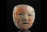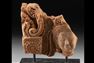 12th C. Medieval Stone Corbel with Dual Faces. Europe, Medieval period, ca. 12th to 14th century CE. A compact block of carved stone animated by two opposing faces, this medieval European corbel blurs the boundary between architecture and imagination. One head presents a human visage with softened, eroded features, while the other is marked by pointed, feline-like ears, suggestive of a zoomorph or demon. Estimate: $6,500 - $9,750.