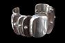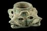 . Pre-Columbian, Peru, Moche culture, ca. 100 to 700 CE. A formidable and sculptural copper mace head takes the striking form of four snarling jaguar heads, radiating outward in a compact, symmetrical composition. Each feline visage is rendered with pronounced snouts, bared teeth, and deeply recessed, openwork eyes, creating a dramatic interplay of light and shadow across the surface. Estimate: $1,300 - $1,950.