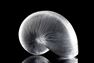 . Western Europe, France, ca. late 20th century CE. A clear crystal glass nautilus shell sculpture formed with fine radiating ribs that spiral inward toward a frosted central core, creating striking optical effects as light passes through the glass. Estimate: $1,100 - $1,650.