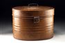 . United States / England, Victorian to Edwardian era, ca. 19th to early 20th century CE. An iron hat box featuring an oval form with a hinged lid and top handle, complete with its original clasp at the front, which includes a loop for securing with a small lock - typical of travel-ready storage from the period. Estimate $450-$675.