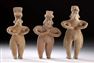 . Pre-Columbian, West Mexico, Colima, ca. 300 BCE to 300 CE. A set of 3 hand-built pottery nude female figures, each standing upon dramatically arched feet while holding both arms up to their chest; each wears a different type of head wrap around their forehead. Size of largest: 1.1" L x 3.7" W x 7.2" H (2.8 cm x 9.4 cm x 18.3 cm) Estimate $450-$675.