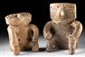 . Pre-Columbian, Colombia, Quimbaya culture, ca. 13th to 15th century CE. A pair of pottery figures exhibiting the distinctive stylization and minimalism of Quimbaya art. Both figures are shown seated with bent limbs and squared torsos, their broad heads featuring prominent noses, incised slits for eyes, and small perforations across the brow and body, perhaps once used for the attachment of ornaments or ritual adornments. Estimate $1,400-$2,100.