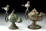 . Near East, Islamic World, Seljuk Period, ca. 11th to 13th century CE. A pair of leaded brass oil lamps, each ingeniously crafted with avian finials and handles, reflecting the Seljuk mastery of symbolic ornament. The more petite example is squat and globular, its lid surmounted by a small bird, while the handle takes the form of a perched bird, lending balance and charm to its compact silhouette. Estimate $1,400-$2,100.