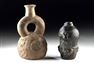 Chavin and Chimu Pottery Vessels. Pre-Columbian, Peru, Chavin, ca. 900 to 500 BCE; Chimu, ca. 900 to 1470 CE. A remarkable pair of pottery vessels that showcase the artistry of two major Andean cultures. The first, a Chavin stirrup-spout vessel, is made of chocolate-hued clay and bears intricate stippled motifs across its rounded body, with carefully arranged dot patterns suggesting textile-like designs. Estimate $1,400-$2,100.