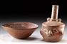Vicus Anthropomorphic Jar & Nazca Painted Bowl w/ TL. Pre-Columbian, Peru, Vicus culture, ca. 100 BCE to 400 CE; Nazca culture, ca. 200 BCE to 600 CE. A striking pair of pottery vessels from two of Peru's most distinctive ancient cultures. The first, a Vicus jar, is modeled in the form of an anthropomorphic head, its rounded body surmounted by a tall neck and twin lug handles at the shoulder. Estimate $1,300-$1,950.