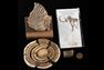 Woolly Mammoth Tusk Cross-Section, Tooth, Hair & Skin. Northern Asia, Russia, Siberia, Republic of Sakha (Yakutia), Ice Age (Pleistocene), ca. 2.6 million to 10,000 years ago. A compelling assemblage of woolly mammoth (Mammuthus primigenius) remains from the permafrost of Siberia. Includes: A cross-section of mammoth tusk, displaying rich mineralized hues and concentric growth rings stabilized with black resin. Estimate $1,200-$1,800.