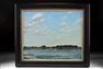 Marc Hanson Painting - "July" (2012). Marc R. Hanson (American, b. 1955). "July" oil on canvas, 2012. Signed at lower right and titled and dated on verso. A soft veil of summer light drifts across this wide open landscape, settling over fields and distant hills with a stillness that feels almost suspended in time. In "July," Marc R. Hanson captures the quiet pulse of midsummer with a palette tuned to subtle warmth - tawny grasses stretching across the foreground, faint greens shifting toward amber, and a sky gently washed in pale tones that speak of heat lingering long after noon has passed. Estimate $1,200-$1,800.